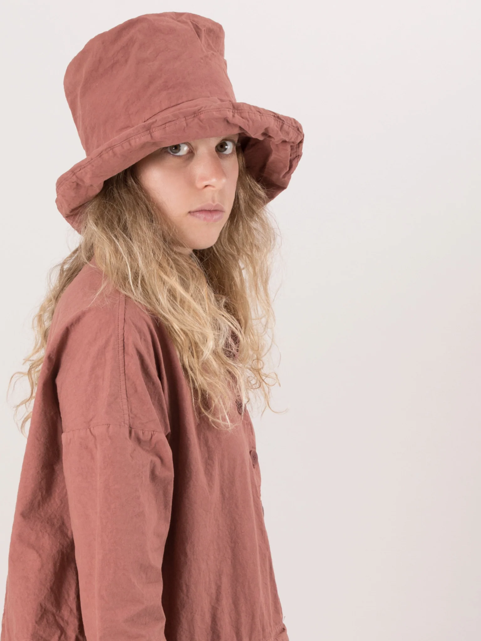 A structured bucket hat from Album di Famiglia featuring a double layer of their signature CC (compact cotton) and TC (paper cotton) fabrics. It features a medium length brim and an exaggerated crown.