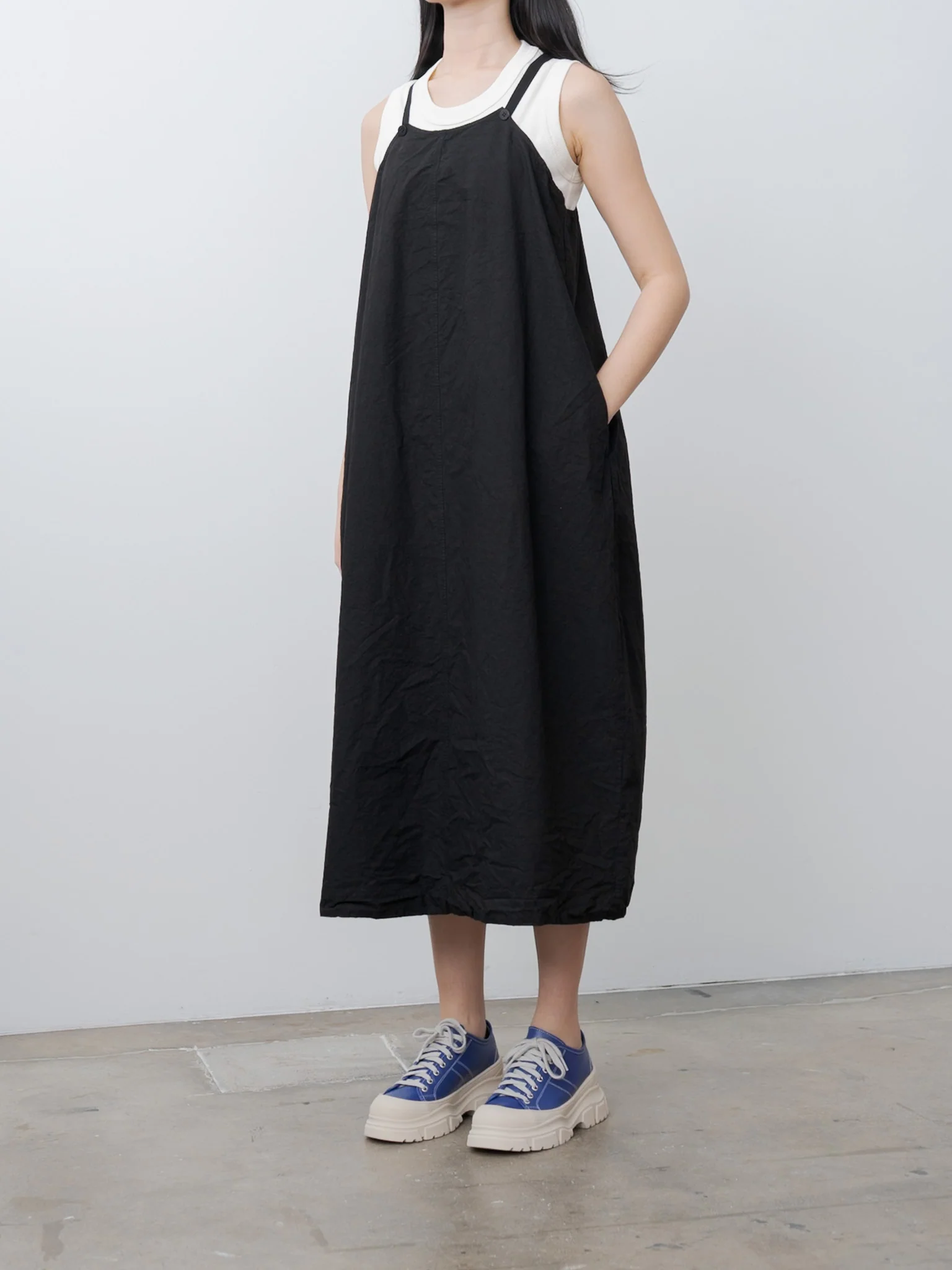 A pinafore-style dress crafted from midweight compact cotton. It features adjustable, buttoned shoulder straps, side seam pockets, a back patch pocket and a straight hem. Relaxed fit.Â