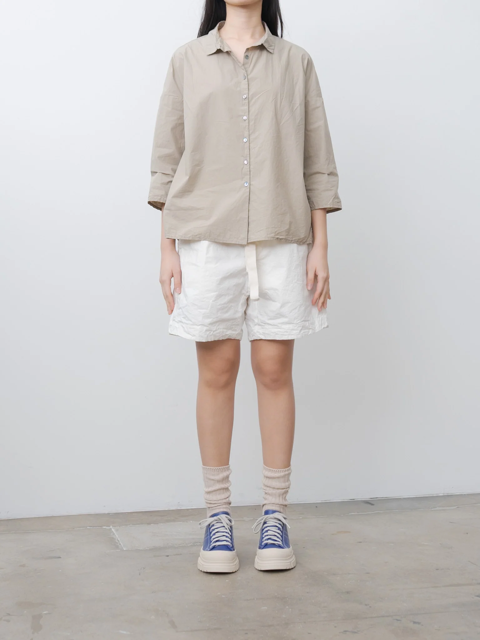 A summer staple from Album di Famiglia. These shorts feature a slightly longer length, wide fit, stretchy elasticated waist with drawstrings, and functional pockets on the sides and in the back. This version is crafted from a midweight compact cotton that offers structure and has a wonderful smooth hand feel.Â