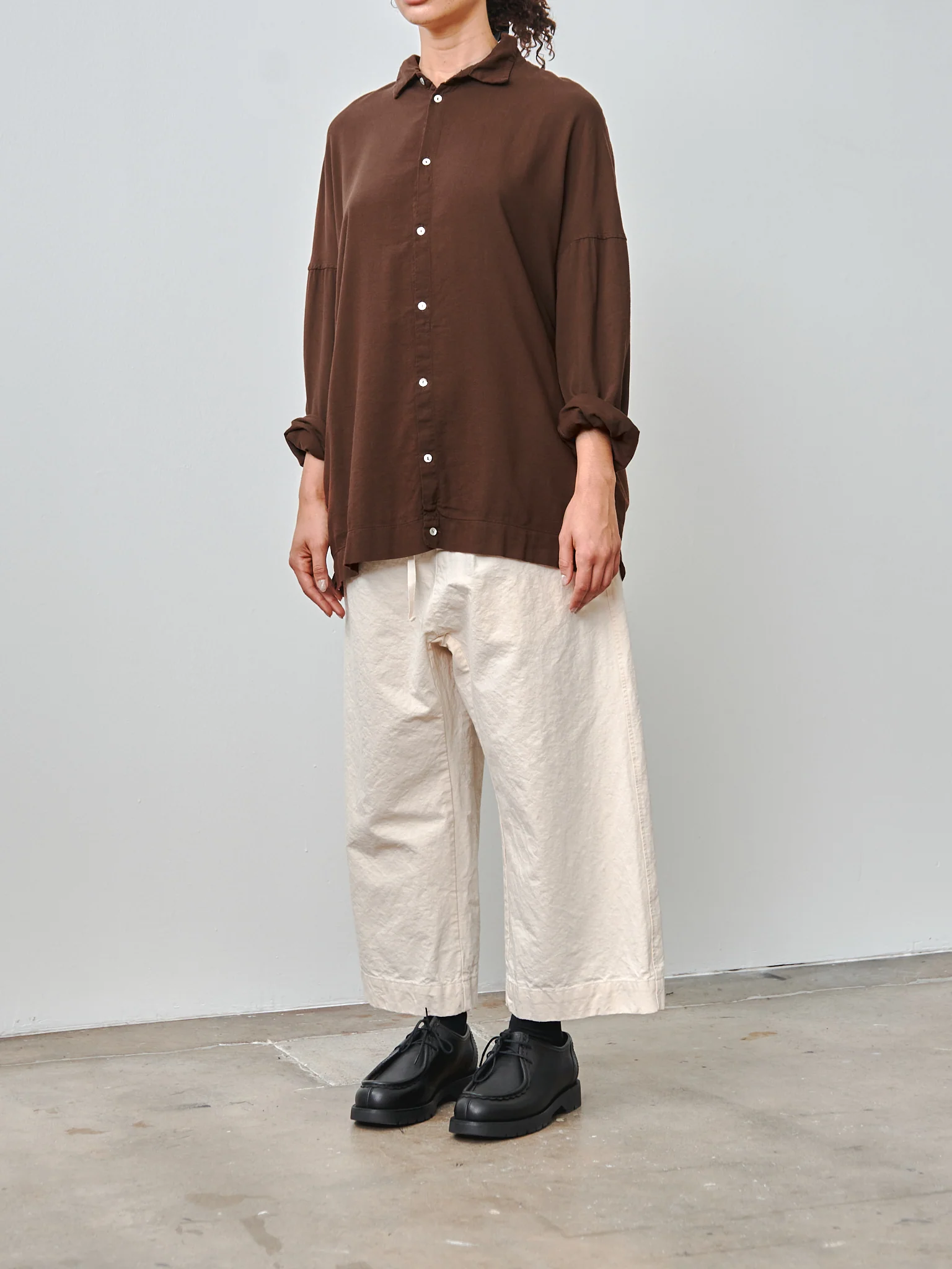 From Album di Famiglia a wide fit button down shirt in a soft, lightweight washed viscose and cotton twill. Details include a point collar, dropped shoulders, shell buttons, and a side split hem. The sleeves are intentionally extra long and meant to be rolled up. Relaxed, fluid fit.