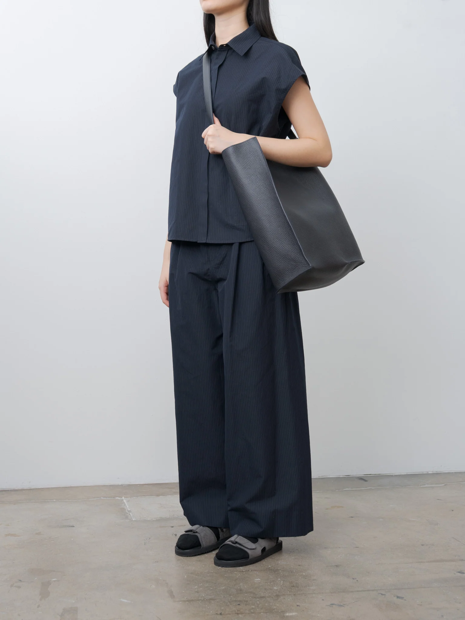 Silk Linen Shantung Two Tucked Pants - Navy x Pinstripe