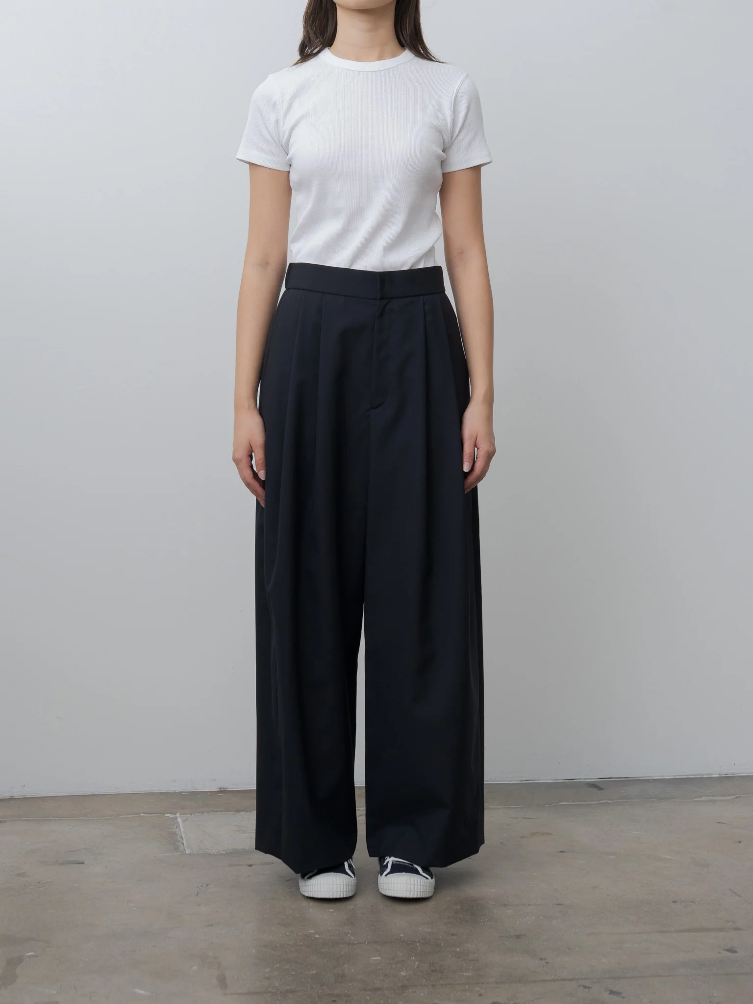 The Wool Tropical Wide Easy Pants are high-rise, two-tuck trousers with a wide, relaxed leg, crafted from lightweight wool suitable for three-season wear. Designed for comfort and ease, they feature an elasticated waistband with inner drawstrings, side pockets, and welted back pockets.