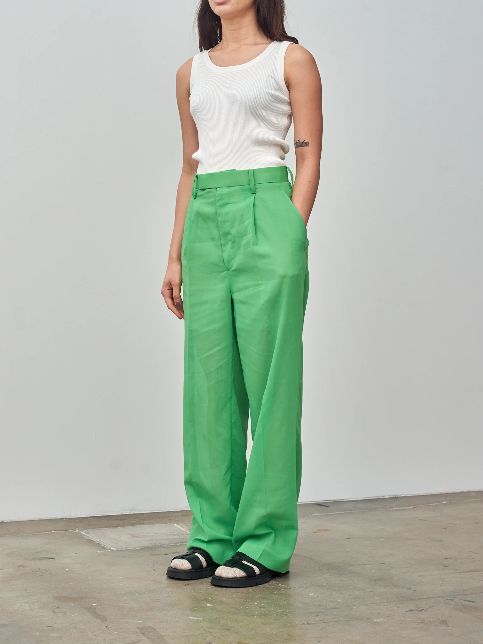 This Auralee pant is made with a slightly sheer organza fabric featuring extra-long Egyptian Finx Cotton for a soft and airy finish. It features wide, straight legs and a relaxed and longer silhouette overall. Details include shorts inner lining, a single pleat front, side pockets, and back welt pockets.
