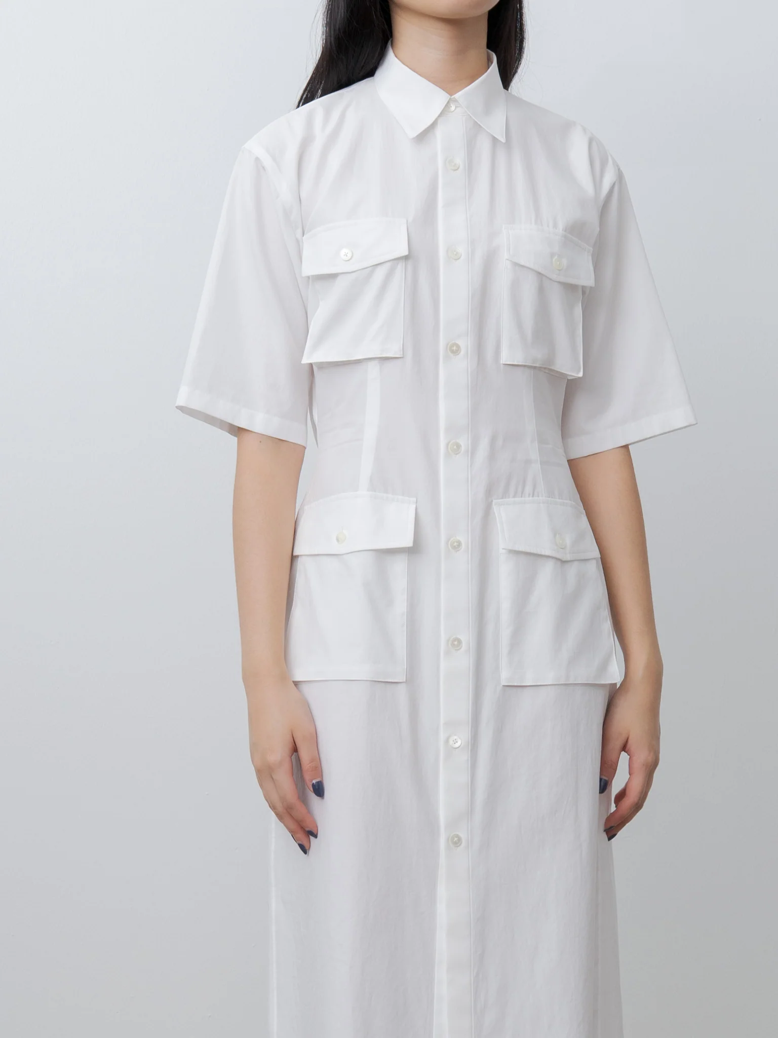 A utiliaritarian shirt dress from Auralee with a feminine touch. The high density Finx cotton was initially stiffened and then beat and washed repeatedly to achieve a soft texture - the result is a supple touch reminiscent of silk, an elegant sheen and beautiful drape. Details include a fully buttoned front, front patch pockets and darts along the waist for a flattering silhouette.