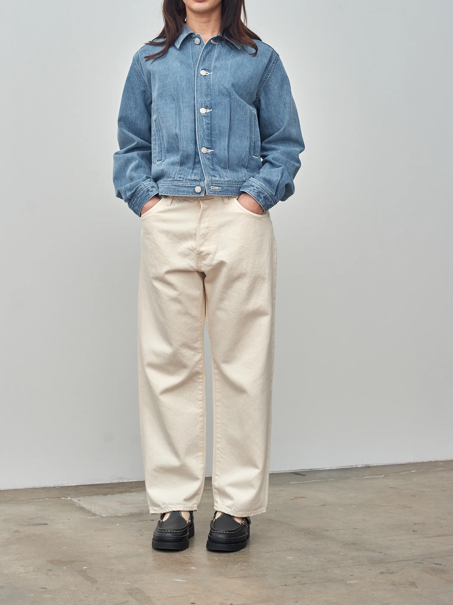 A closet staple revisited - the denim jacket with an elegant Auralee touch. The denim is woven slowly on a shuttle loom using rope-dyed nep and high-quality Suvin cotton, resulting in a vintage look with a soft texture. The unique faded color patterns are created by repeated processes including hand wrinkling, washing, and bleaching by skilled craftsmen. Other details include a pointed collar, gunmetal buttons, and a regular fit.Â