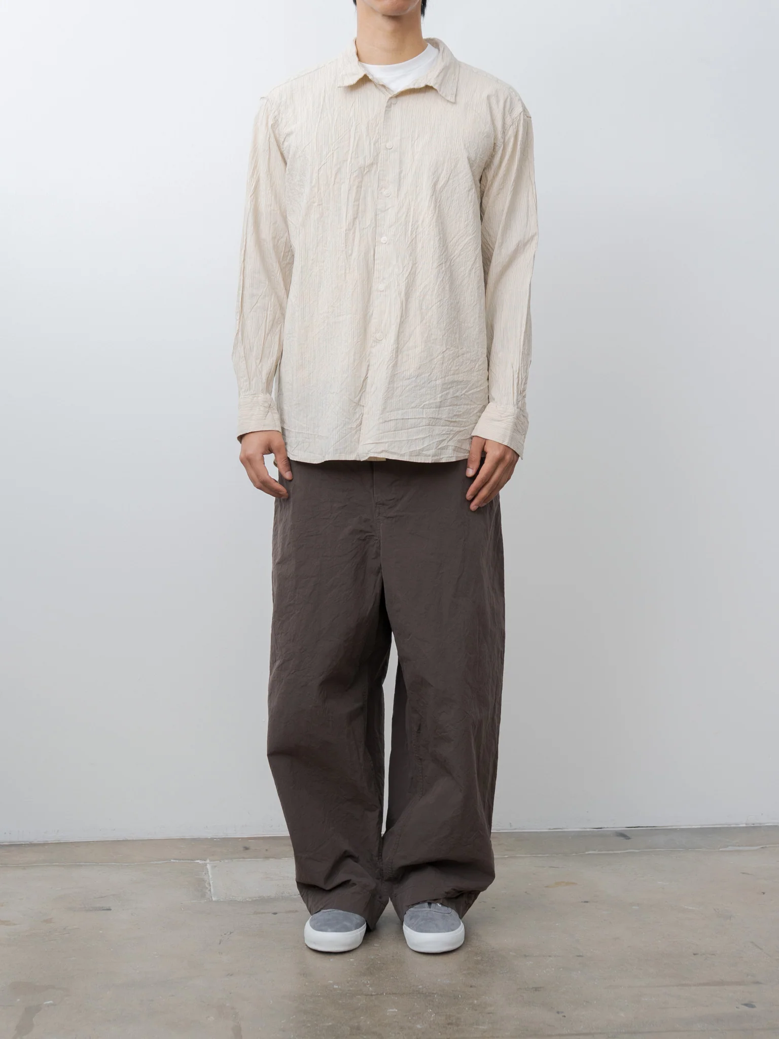 A relaxed fit shirt made from a lightweight, washed cotton in a wind stripe pattern. Features a soft spread collar, button front closure, curved hem with a longer back, buttoned cuffs, and corozo buttons throughout.