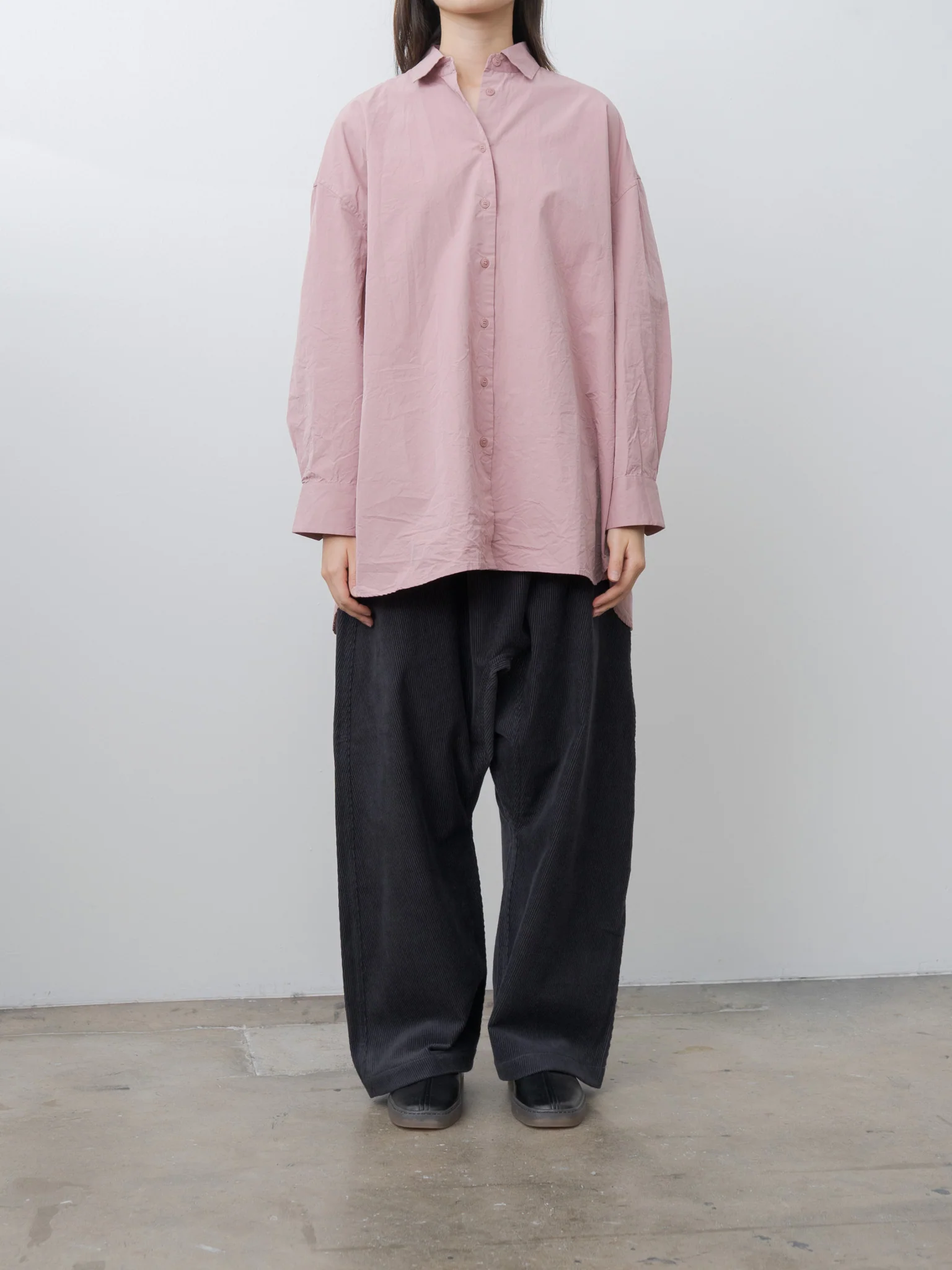 The Hamnet shirt is an oversized button down shirt from Casey Casey made with a smooth, lightweight paper cotton. It features an effortless drape with a sweeping curved hem with an extended back, dropped shoulders, buttoned cuffs, a regular collar and tonal corozo buttons.