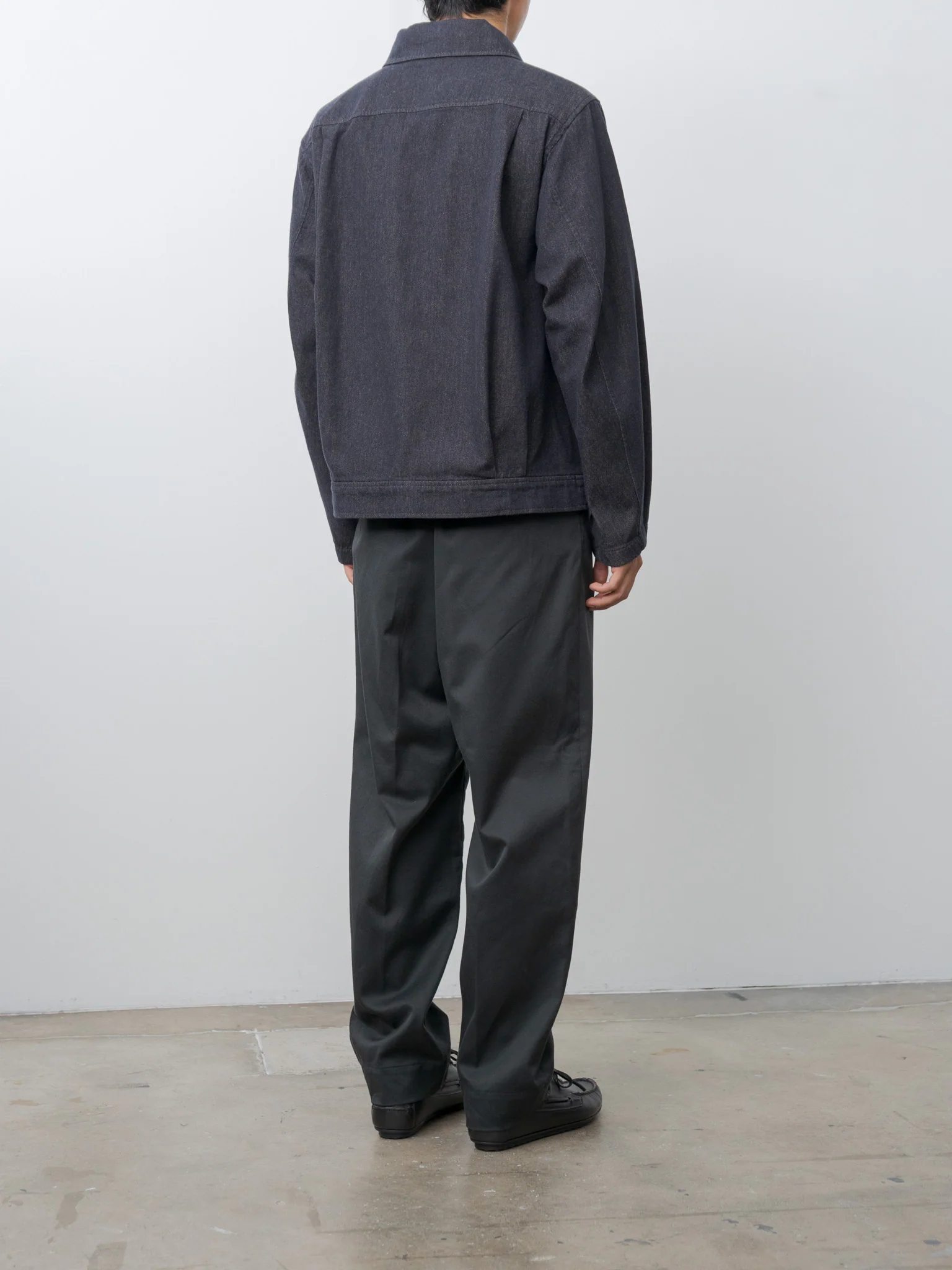 A trucker-style jacket made from a special Japanese denim blended cashmere, offering a soft texture and subtle sheen, atypical for a denim jacket. Details include curved 3-D chest pockets, side pockets, natural horn buttons, a garment-washed finish for a natural appearance.