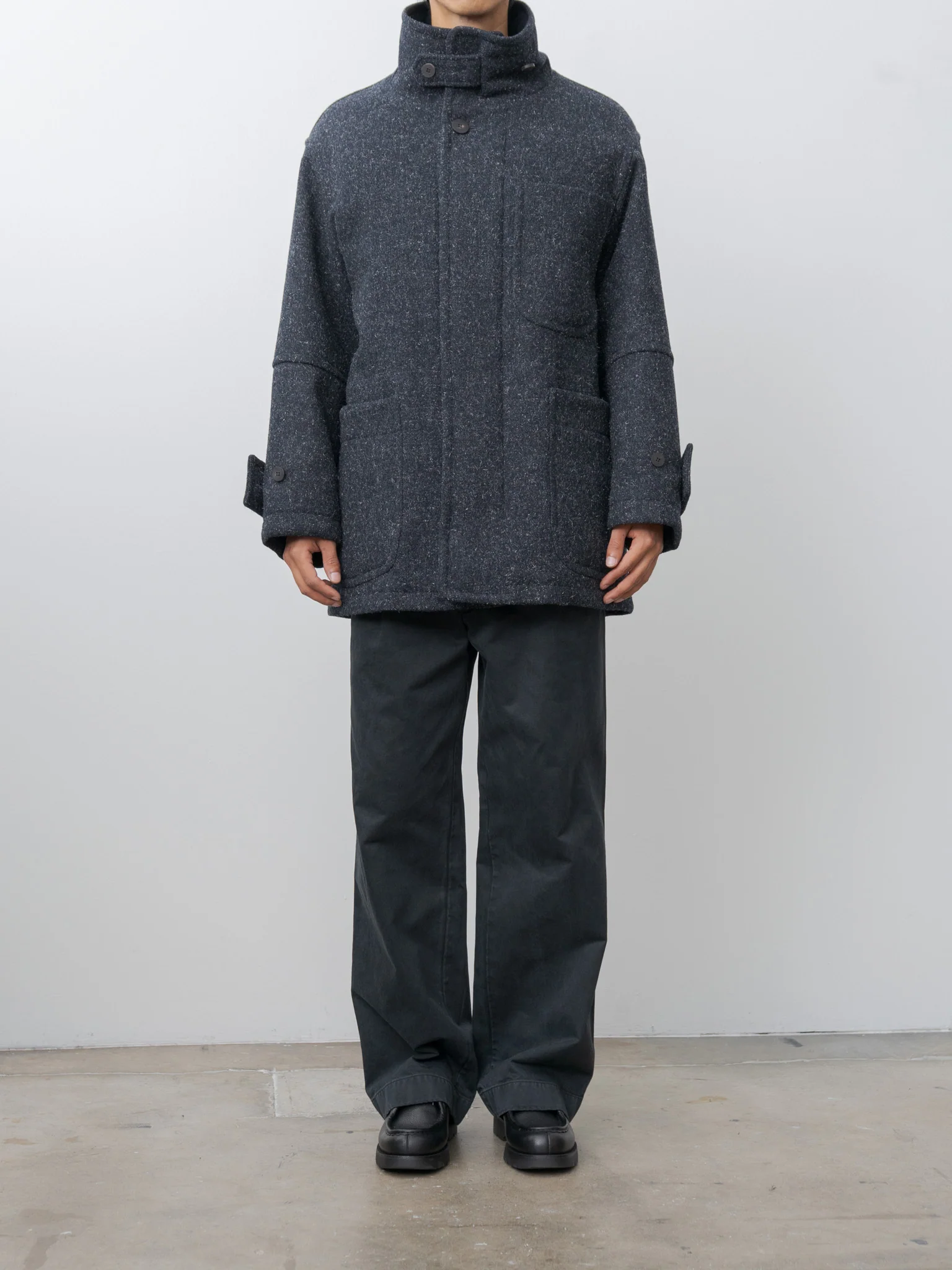 This half-length coat features a structured, car-coat silhouette crafted from dense wool Kemp Melton, offering natural warmth, durability, and a rich, nepped texture. It includes a detachable cotton lining trimmed with shearling for added insulation, a high stand collar with button fastening, flap pockets, and a clean front closure finished with real horn buttons. The interior is padded with lightweight 3oz insulation, while the ultrasuede-lined collar provides a soft, comfortable touch against the skin.