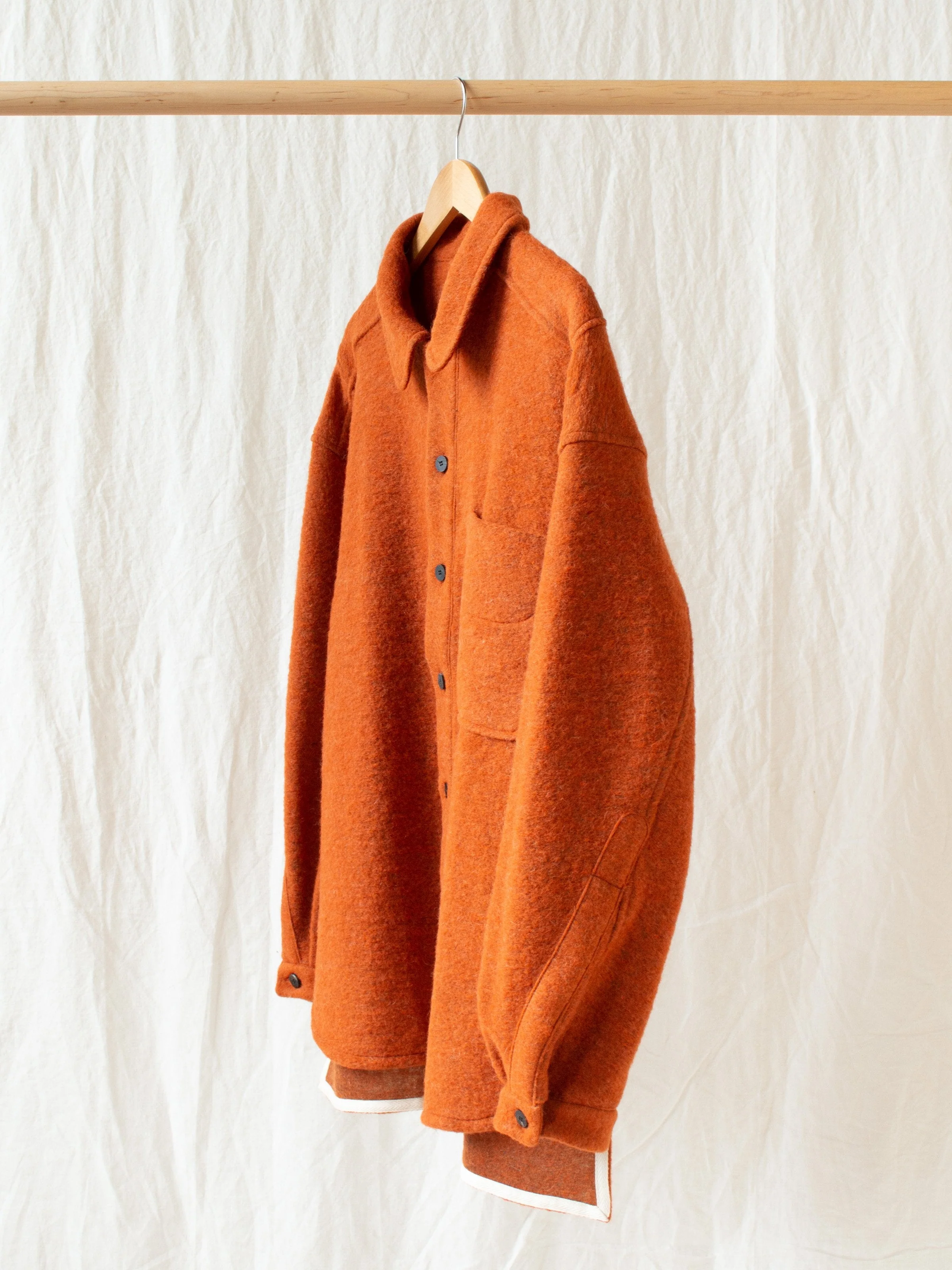This season, DOCUMENT plays with a new color, a burnt orange. Reworking the “Sliba” fabric (most recently used in last year’s Robe Coat), the wool blend is springy, pliable, airy, but warm. Following up on this past spring/summer’s new design, the “Set Up Shirt,” the Wool Shirt features our most interesting hem line and a crafty panel construction to create the best slouchy top.