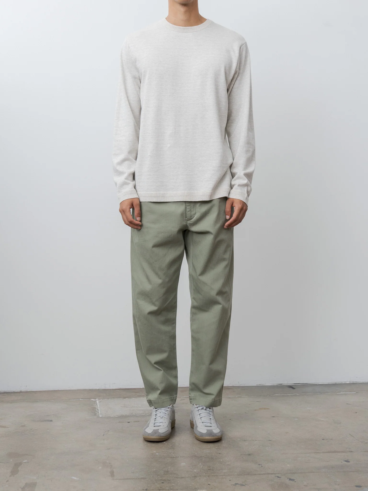 The Border Knit T-Shirt has the ease of wear that you’d expect with a cotton-based tee but with an elevated look and feel. It features a soft cotton knit with subtle heather stripes throughout. Details include ribbed cuffs and hem with side slits and a loose fit.