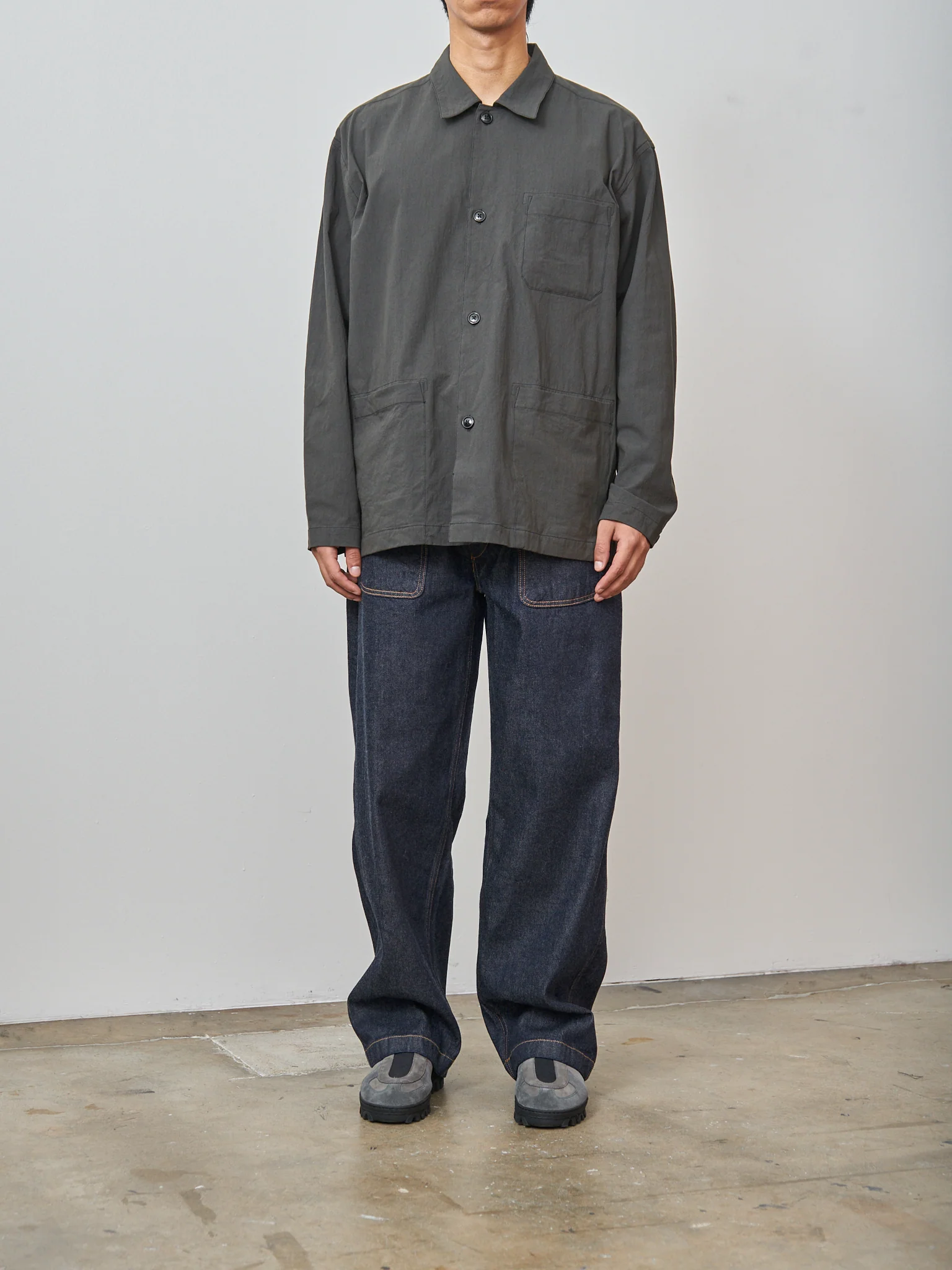 A coverall shirt jacket from Fujito in a beautiful original fabric - the midweight cotton feels dry touch and has a unique texture. Details include a regular collar, large patch pockets on the chest and front sides, dropped shoulders, shirred yoke and side split hem. Light enough to wear as a shirt or a jacket. Wide, relaxed fit.