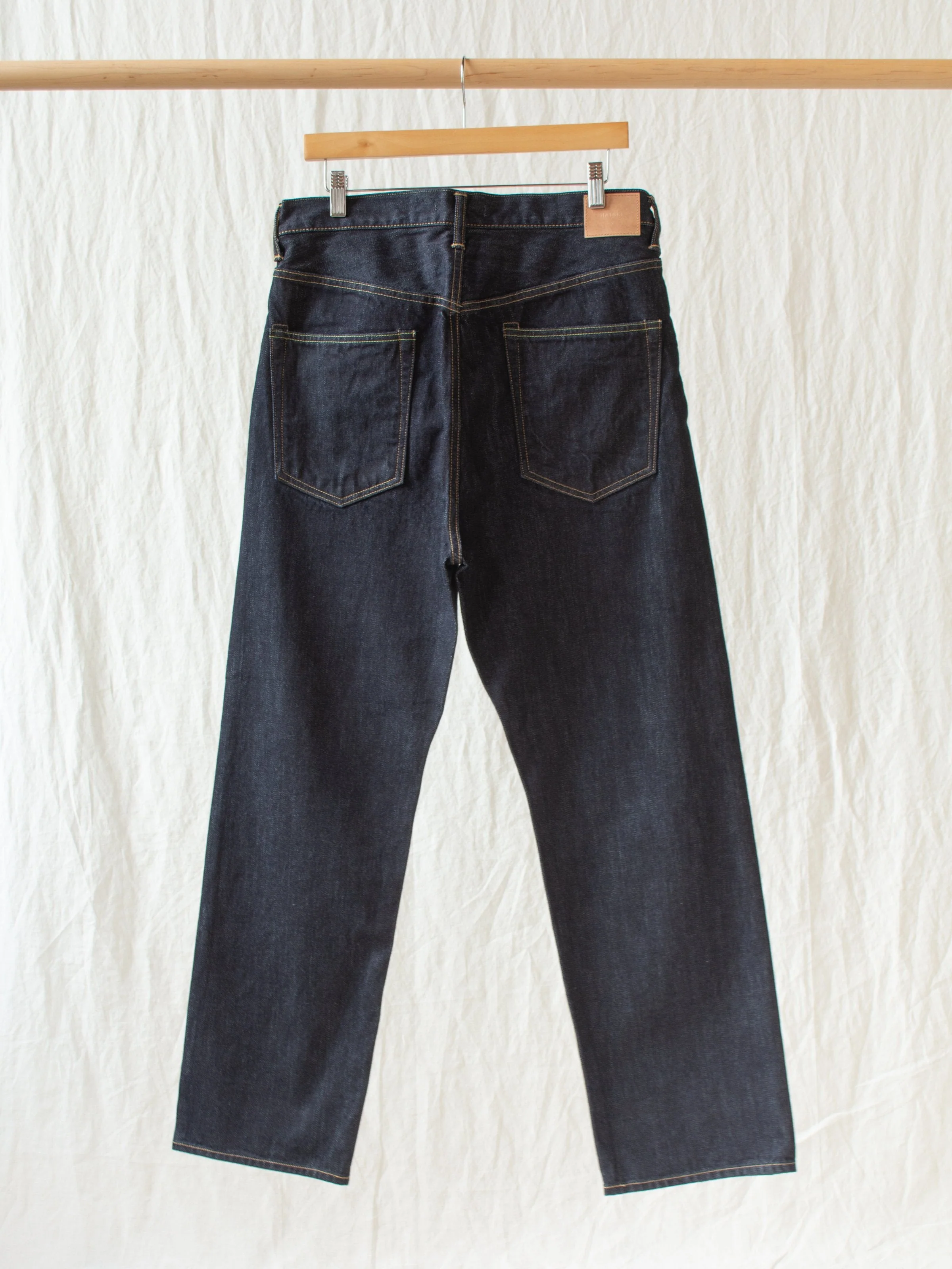Our widest offering from HATSKI, the Straight Denim has plenty of volume – we consider it artful when wider pants somehow look fitted and structured, instead of downing the wearer in fabric. The Straight Denim tapers in at the hip and seat, while maintaining a wide block throughout the leg. HATSKI uses a 15.6 oz sanforized selvedge denim woven on vintage looms, known for its especially tight weave that has a softer, broken-in feel.