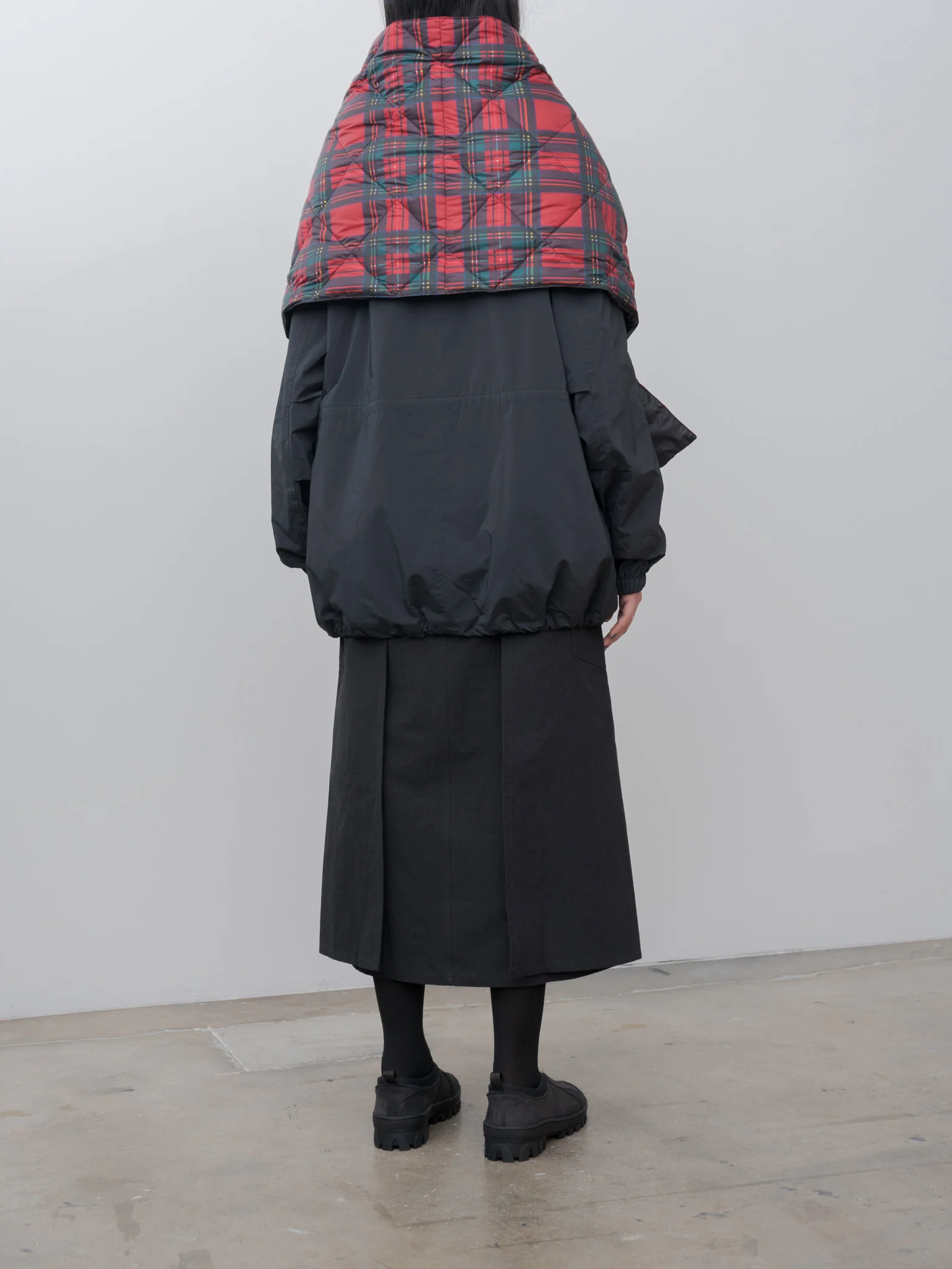 This Down Shawl is collaboration between Ichi Antiquites and TAION featuring red tartan on one side and black on the other. Lightweight yet warm, it is filled with high-quality down and has a water-repellent nylon taffeta outer. Details include zipper pocket and a loop handle for threading through the scarf on one side. This versatile piece can be worn as an accessory, outerwear or blanket on the go.Â