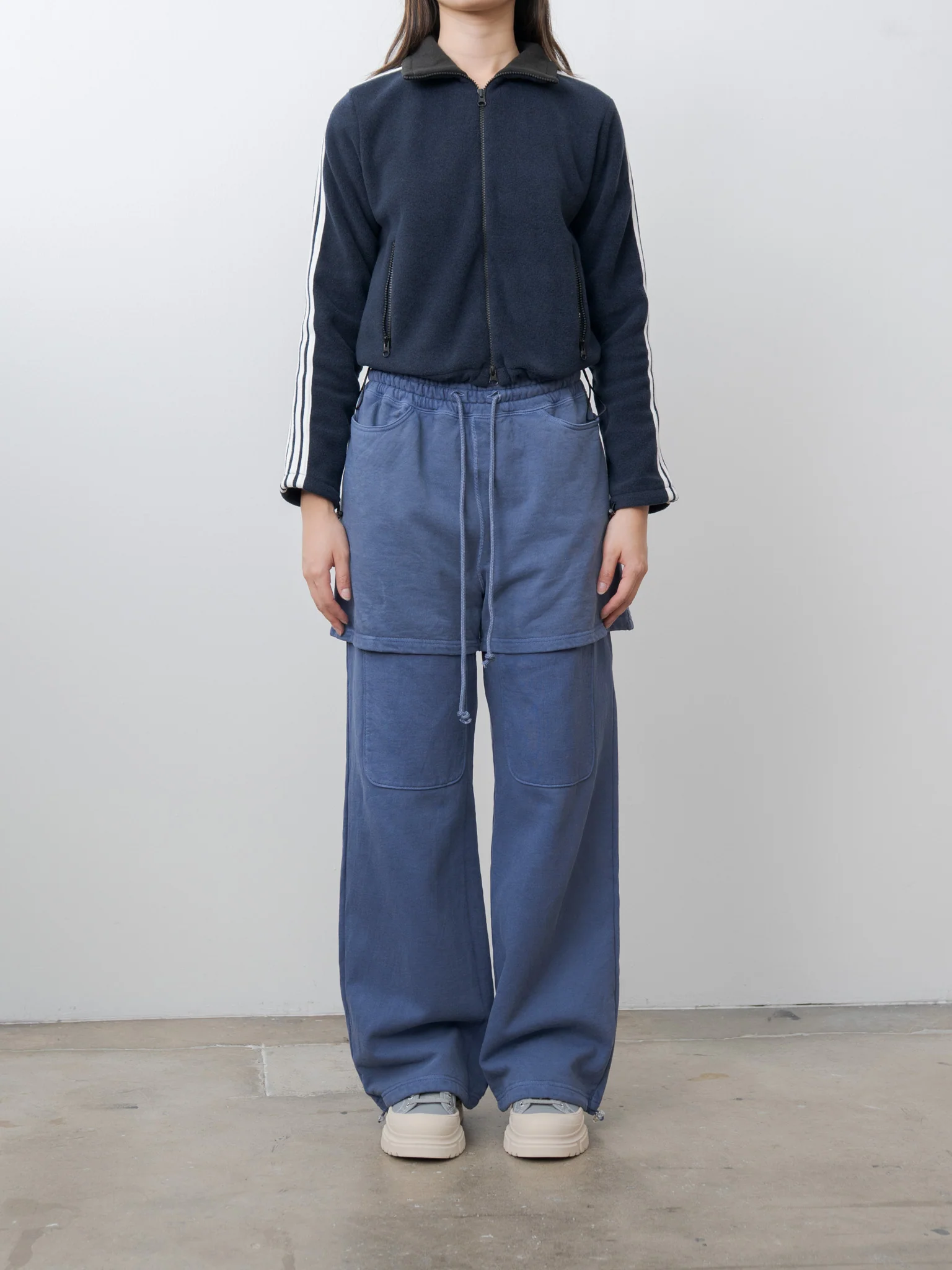 A cropped, fitted track jacket made from soft, voluminous fleece. The sporty, close silhouette creates a playful contrast when paired with voluminous trousers or skirts. Details include a high neck that can be worn folded down, a zip front, zip side pockets, adjustable drawcords at the hem and cuffs, and a tumble-processed finish to help minimize pilling.
