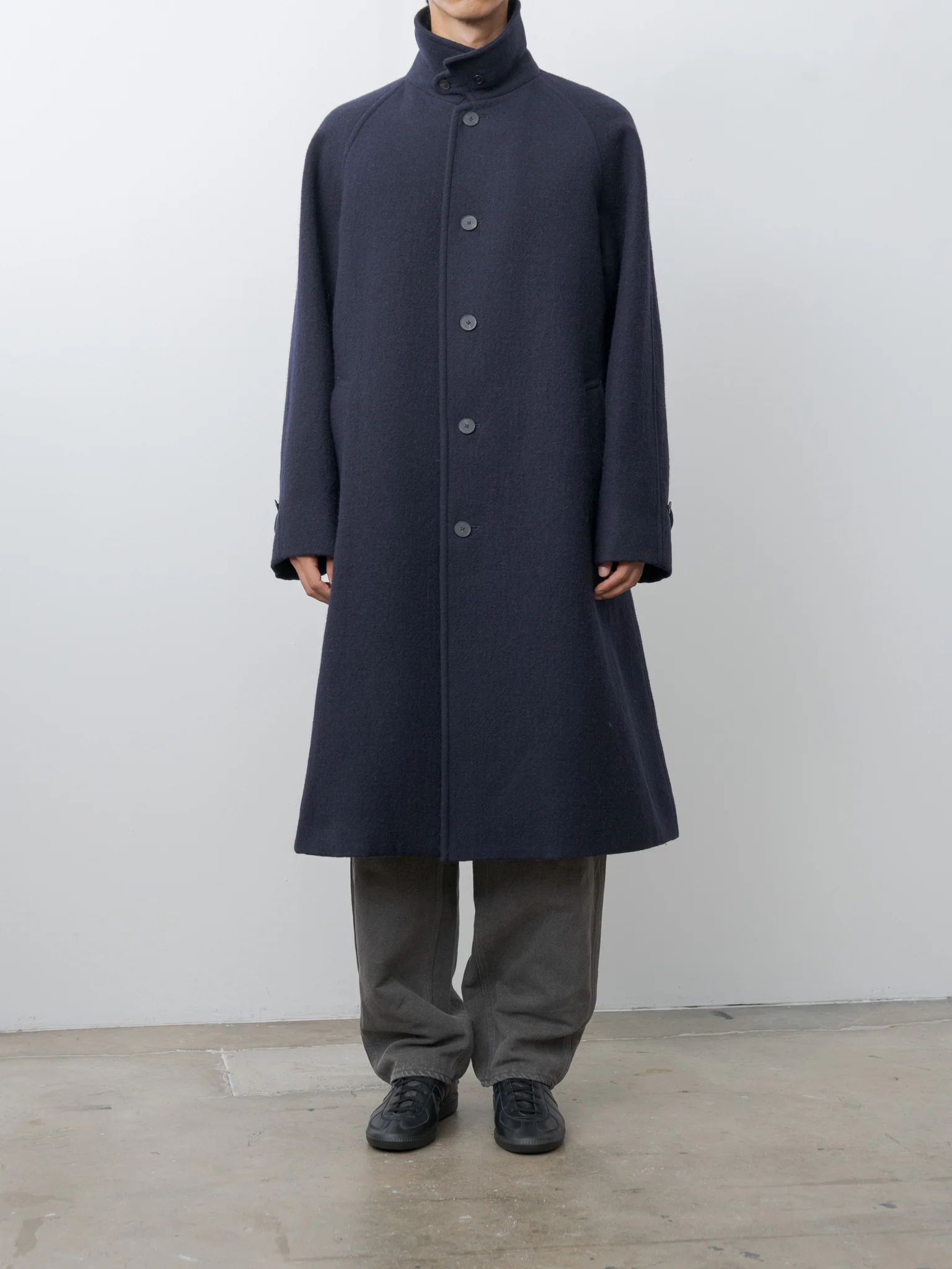 A fully lined, relaxed-fit overcoat constructed from a beautiful double cloth fabric woven slowly and densely using a blend of alpaca and merino wool. The material is thoroughly felted to achieve just the right amount of volume, offering both structure and warmth. Details include raglan sleeves that naturally drape over the shoulders and over heavier knits, buttoned front, adjustable cuffs, side pockets, inner pocket and a back vent.Â
