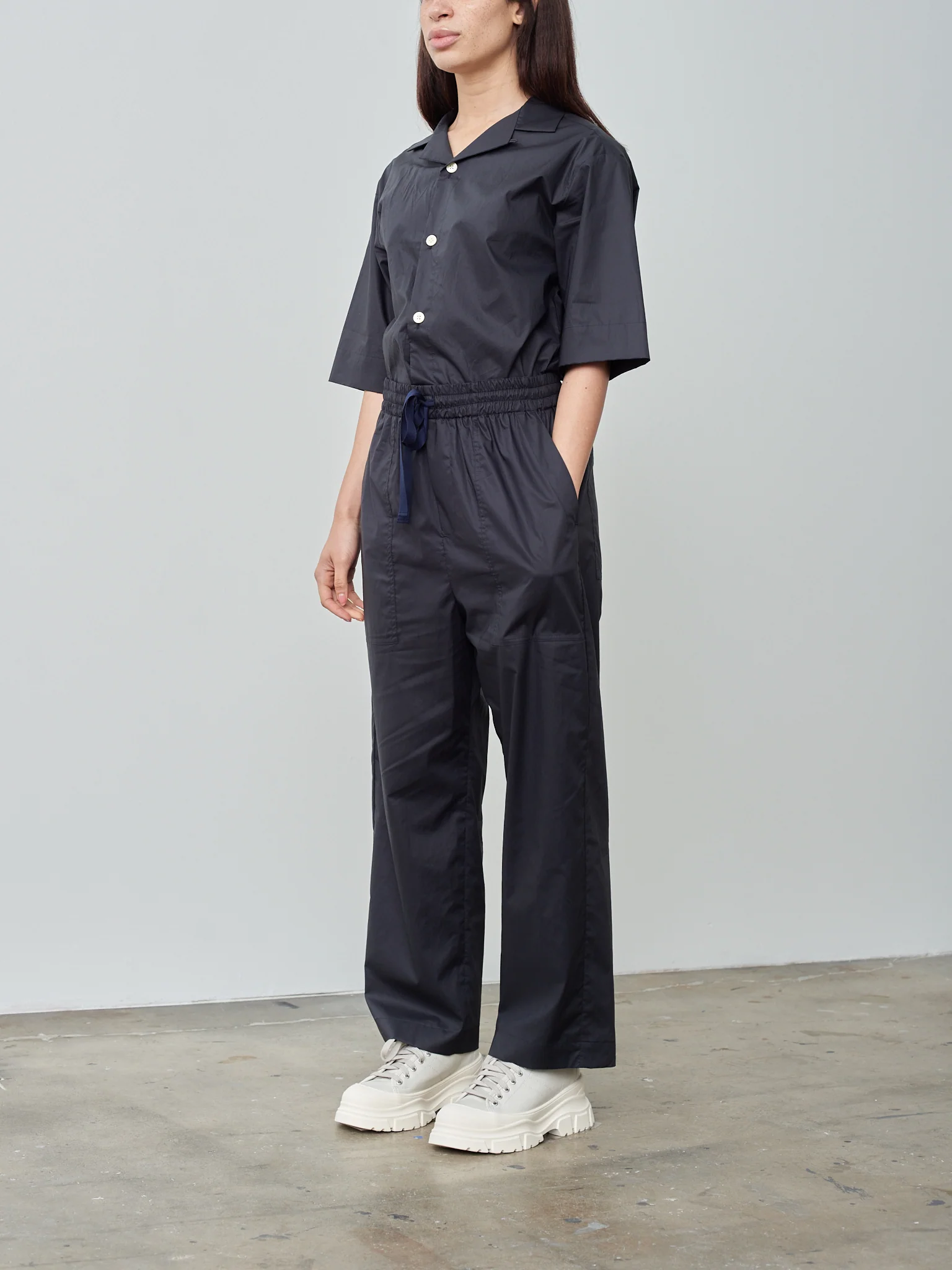 This Nicholson & Nicholson jumpsuit features an open collar top and utility style bottoms, complete with patch pockets on the front and back. Other features include an elasticated waist and drawstring for a comfortable, adjustable fit.