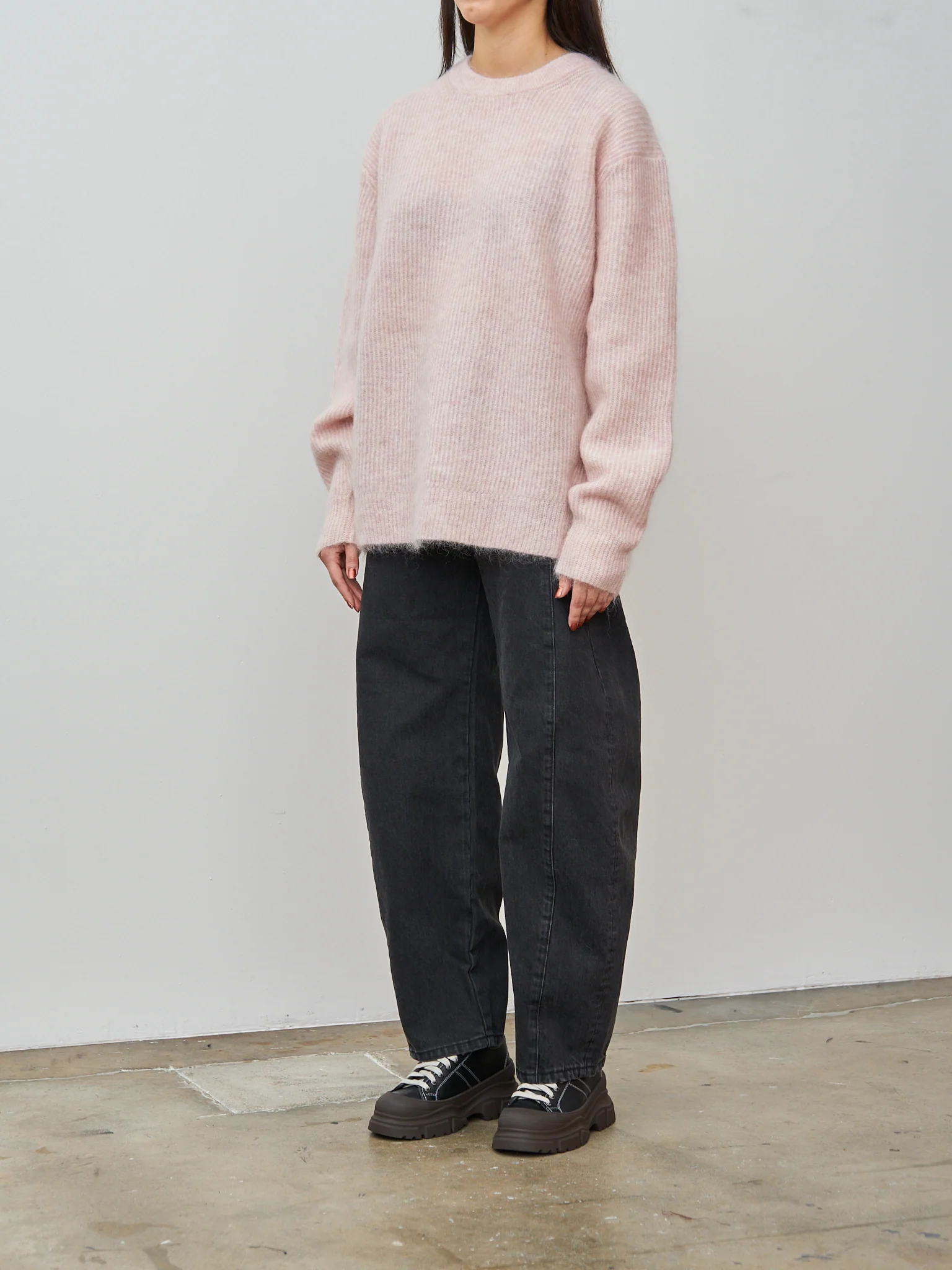 An oversized, boxy fit mohair sweater with a loose hem. The low gauge mohair blend feels light, soft and warm and is resistant to pilling - you can wear it alone or layered over a tee for extra warmth. The single rib structure helps keep its shape with wear. Relaxed fit.