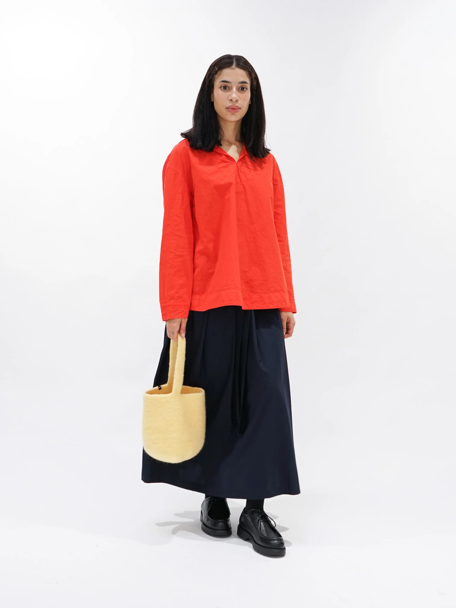 Introducing Cecilie Telle, an independent designer based in London who crafts functional wool pieces with a playful touch. The small bucket bag has a rounded, bulbous base with a short strap - a cute companion for an outing. We love how it looks from every angle, however you're holding it.Â