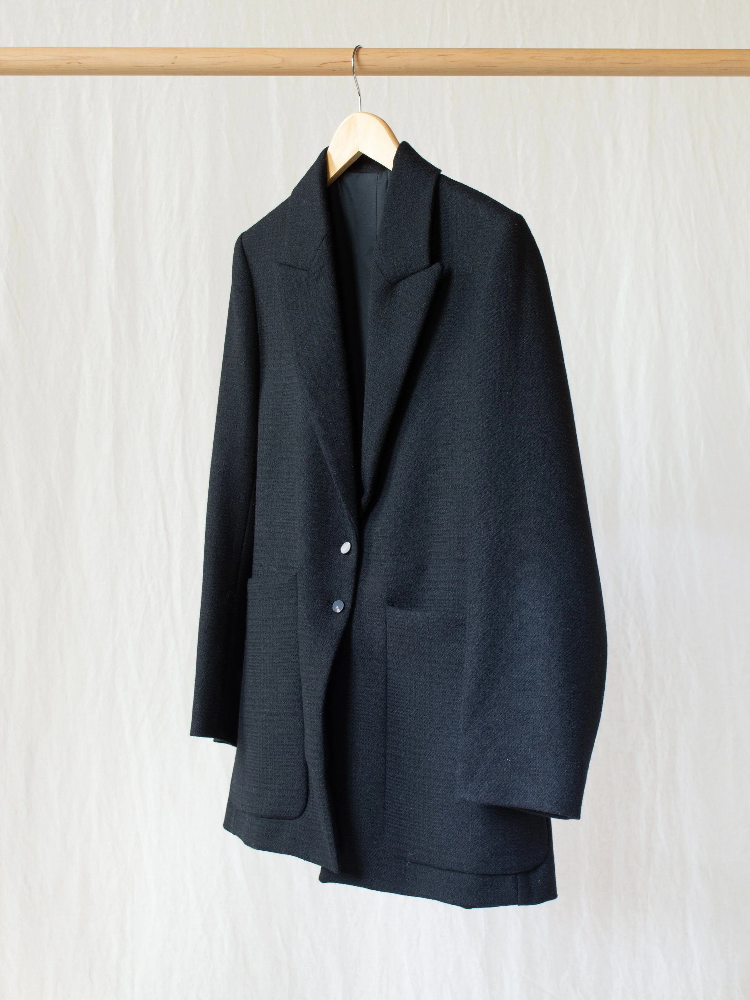 A boxy, tailored jacket cut in ghost blackwatch check wool. Features a slightly fitted body, two large front pockets that slightly wrap around the sides and a two button fastening. This jacket is fully lined. Pair with black jeans or over dresses with boots for a chic look.Â