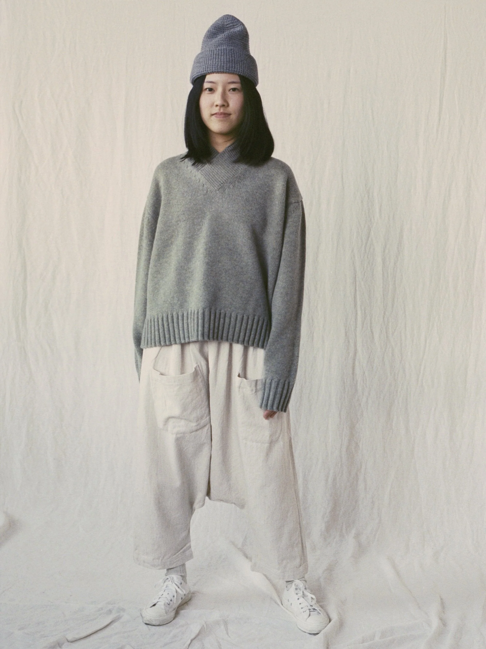 100% British lambswool knit from Studio Nicholson in lovely, matcha green. Long sleeves, special v-neck, and rib detail at the neck, cuff and hem. It's got a good weight to it and is very warm. Relaxed fit. Made in England.Â