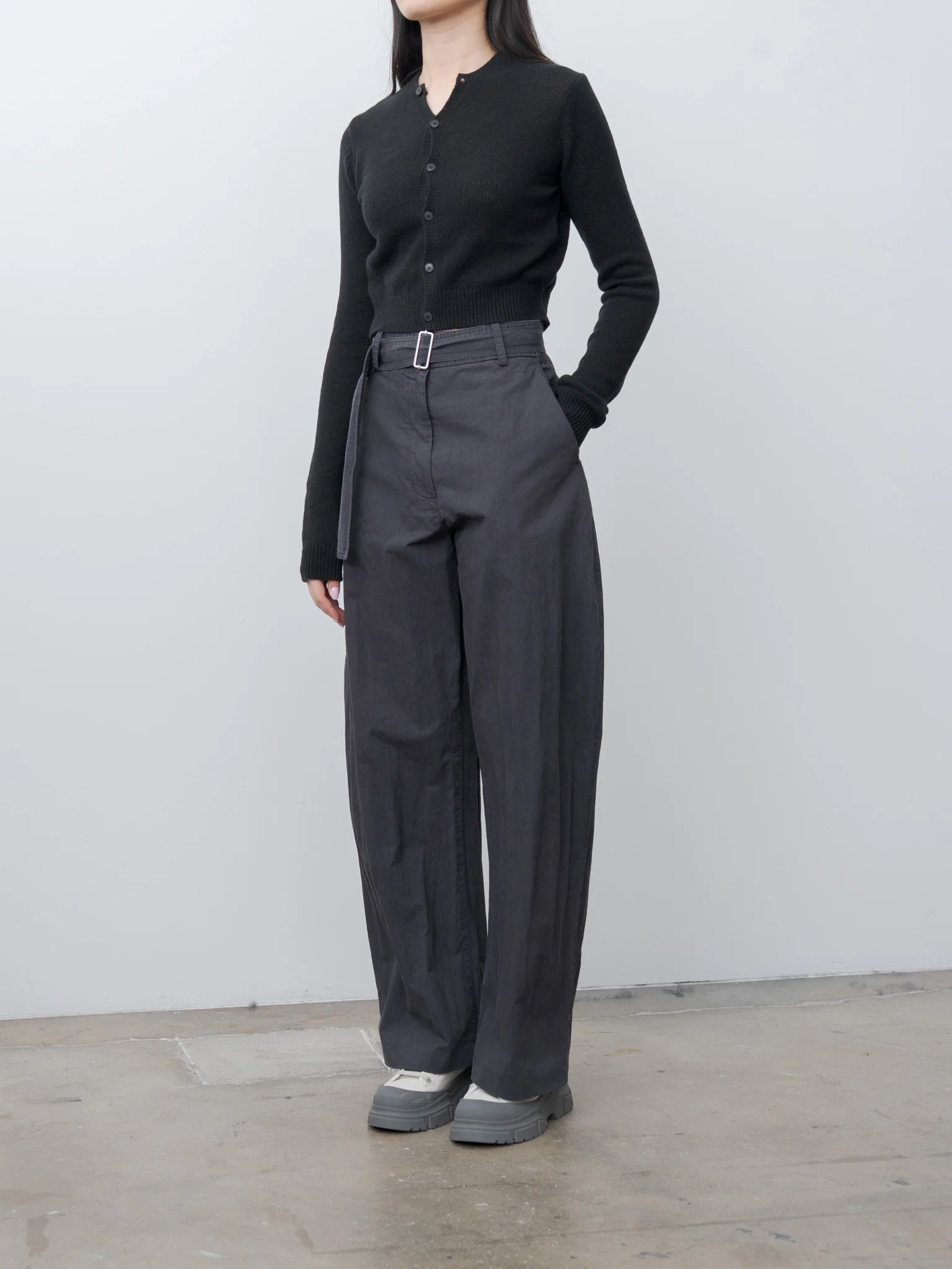 The DORING Trousers are made from a Japanese cotton-nylon blend with a crisp, dry hand feel. It features a high waist fit with a detachable belt and full length wide legs. Details include a flat front, zip-fly with button closure, and side pockets and rear patch pockets.