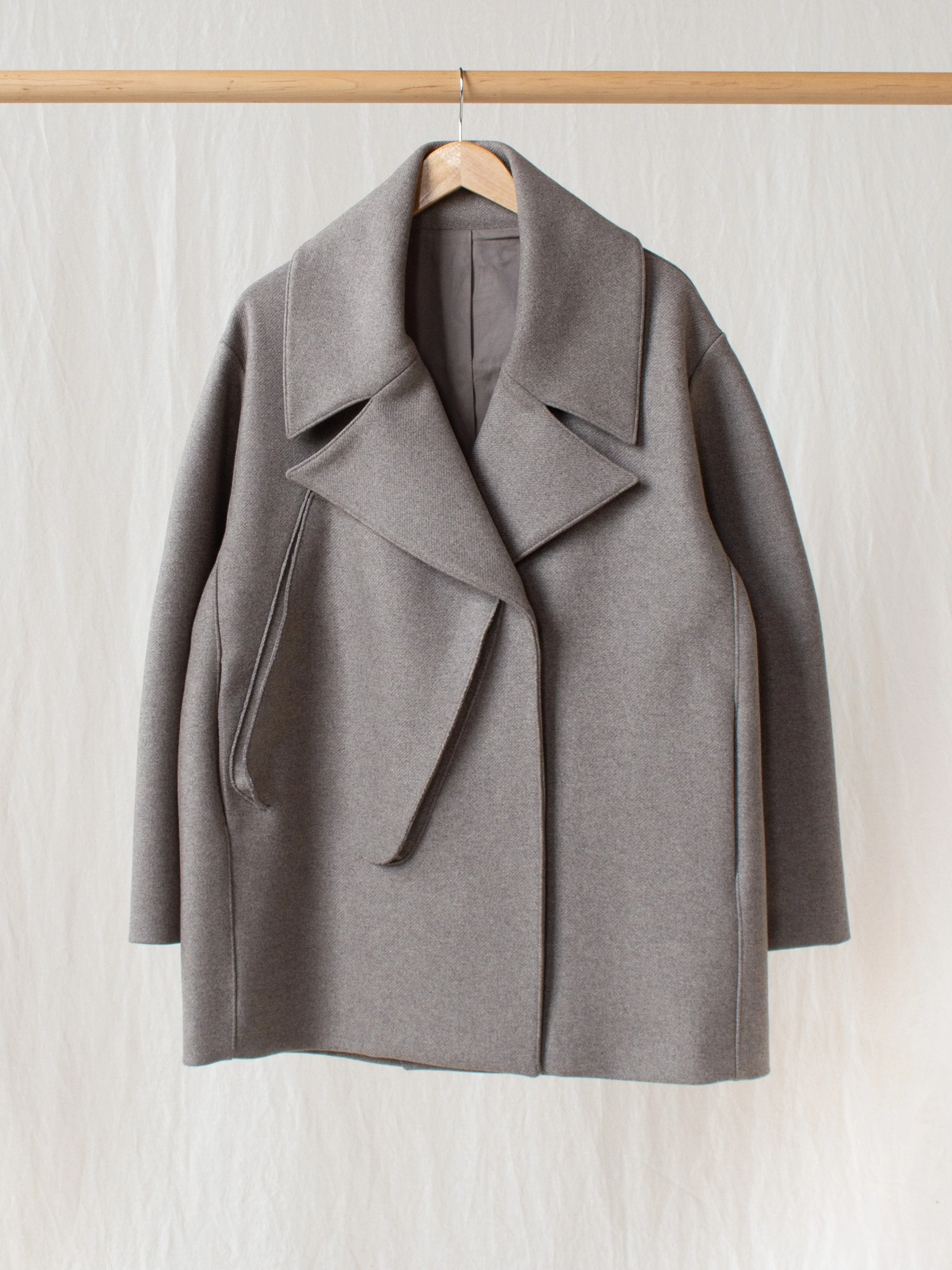 Oversized double breasted pea coat, featuring an asymmetrical 3D pocket on one side. The Myrio coat has a slight drop shoulder and rounded shape creating a fuller silhouette. An architectural piece you will treasure for years to come. Made of 62% Wool, 38% Polyamide, with a good weight to it. Relaxed fit - we recommend sizing down one size if you are petite. Made in England.Â