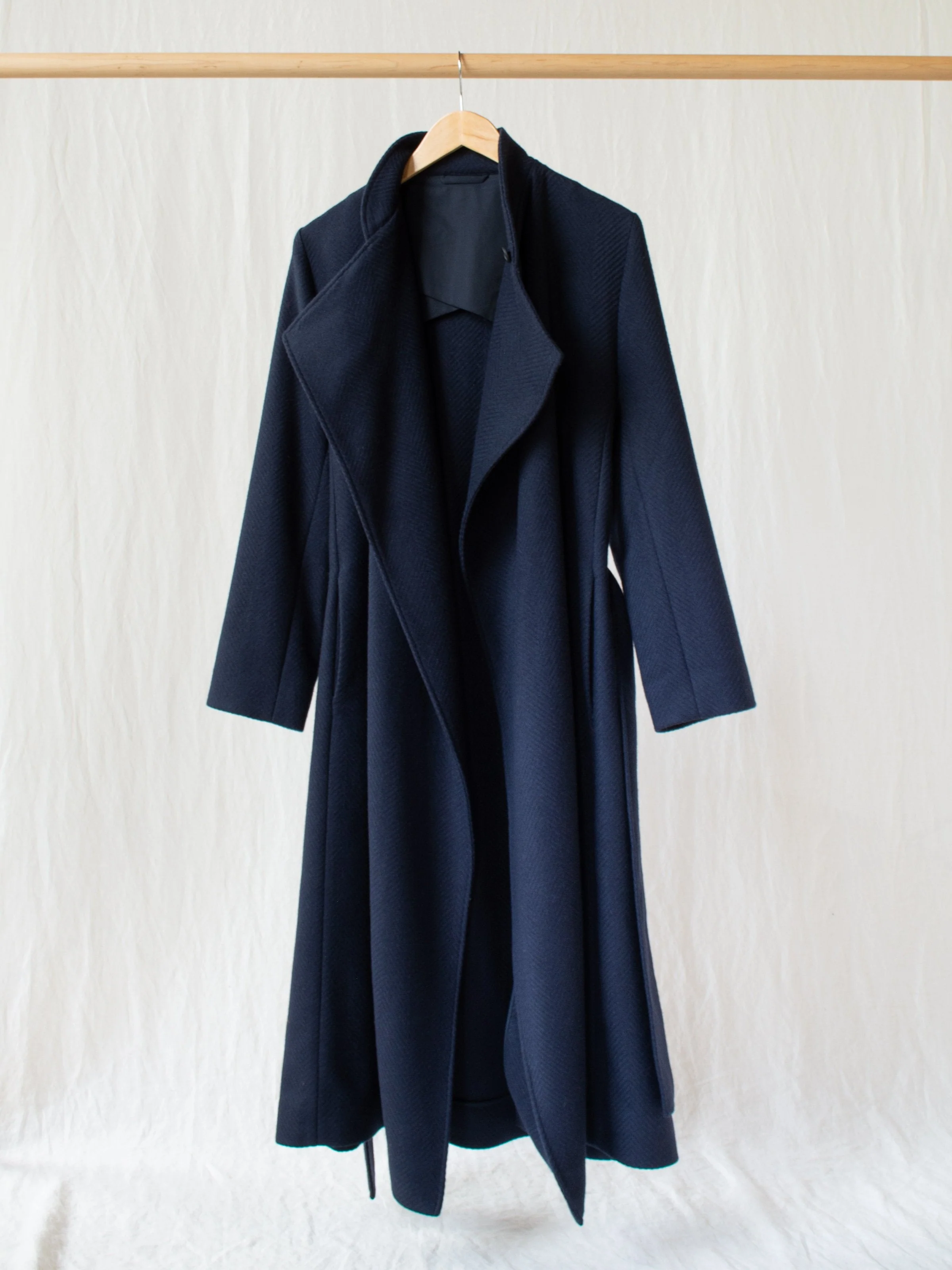 A belted wrap coat with beautiful drape from Studio Nicholson. Cut in navy ghost herringbone wool. Button closure at the neck allows for multiple ways of styling. Comes with optional belt in matching fabric.