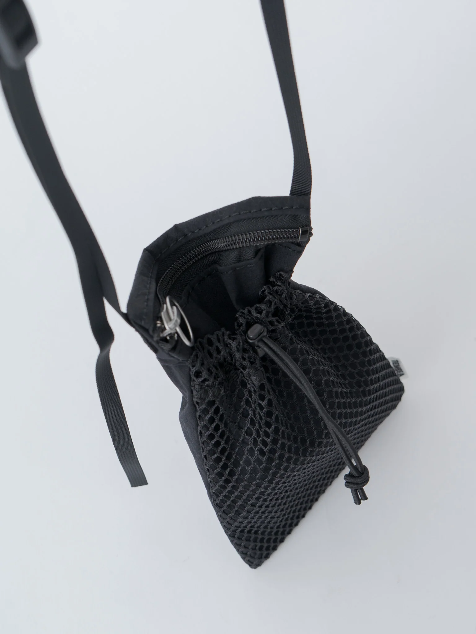 A compact shoulder/crossbody bag designed for lightweight carrying. It is made from durable, lightweight, and water-resistant nylon. Details include a top zipper closure, an outer mesh pocket with an elastic cord, and an adjustable shoulder strap.