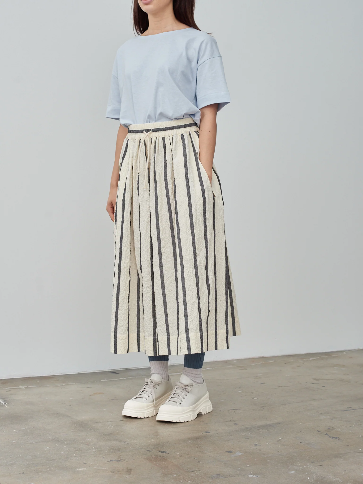 The Acrobat is an easy fitting 3/4 length culotte with lots of volume gathered into a deep elasticated waistband with a drawstring tie. It appears like a skirt but has the flexibility of comfy trousers. We love the bold stripes and the soft crumpled texture on the lightweight cotton. Side seam pockets.