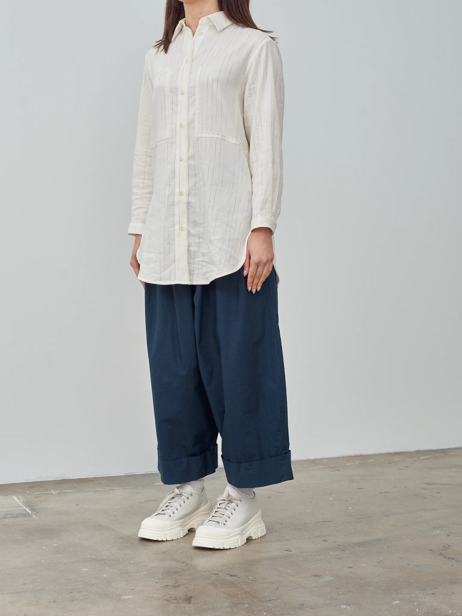 The Tailor Shirt in Fading Stripe is a soft, lightly textured cotton linen button down with an irregular pinstripe gently fading in and out of the weave. This is an easy fitting collared shirt with soft shoulders, generous side split openings and a curved hem. It features raw deconstructed front pockets and placket detailing.