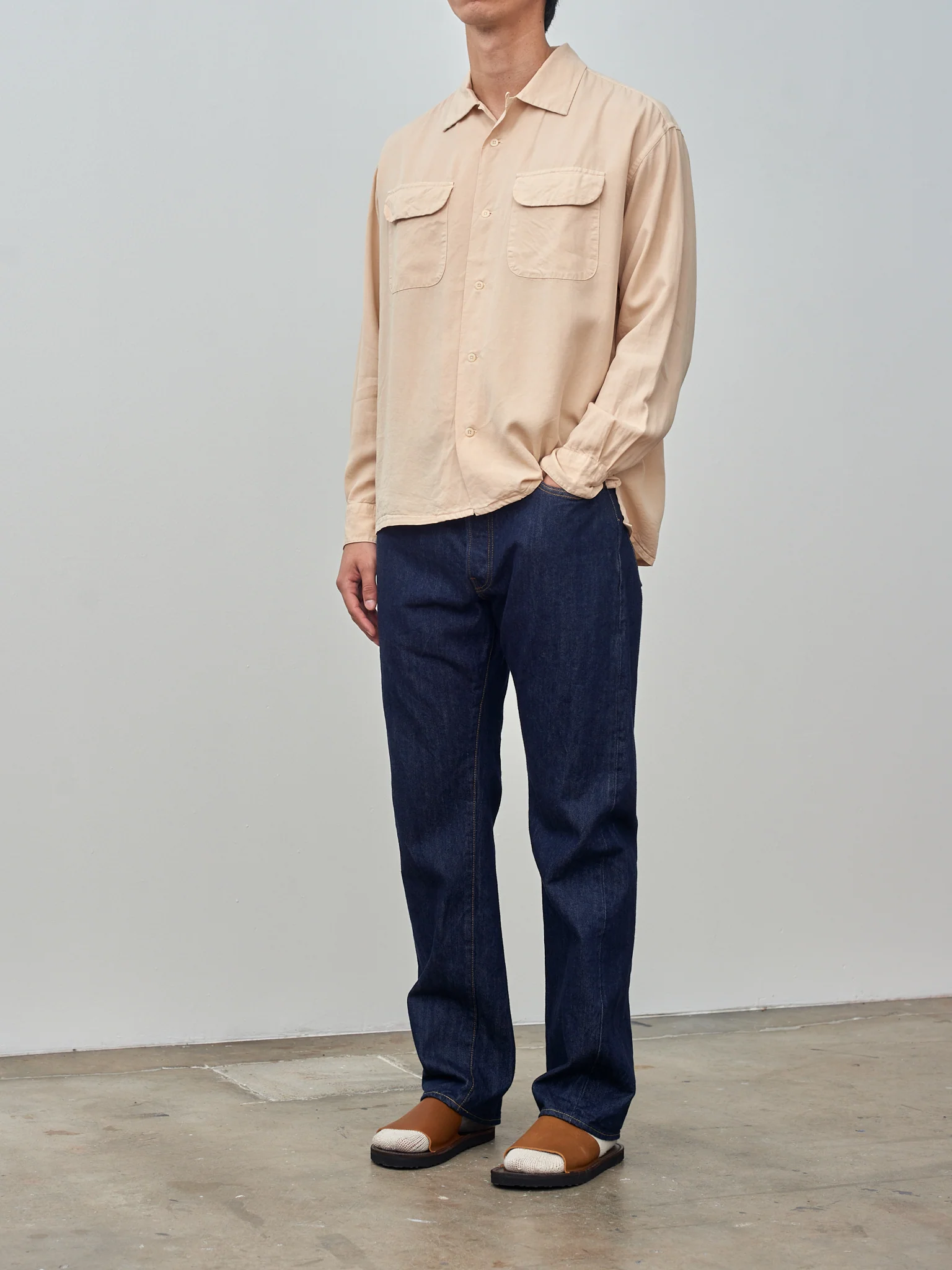 This is the long sleeve version of the Round Flap shirt from ts(s). We love the garment dye that adds a vintage look and feel, and the fabric feels incredibly smooth, lightweight, and cool to the touch. Details include an open collar, two round front flap pockets, inner locker loop, wide box pleat on yoke, and mother-of-pearl buttons.