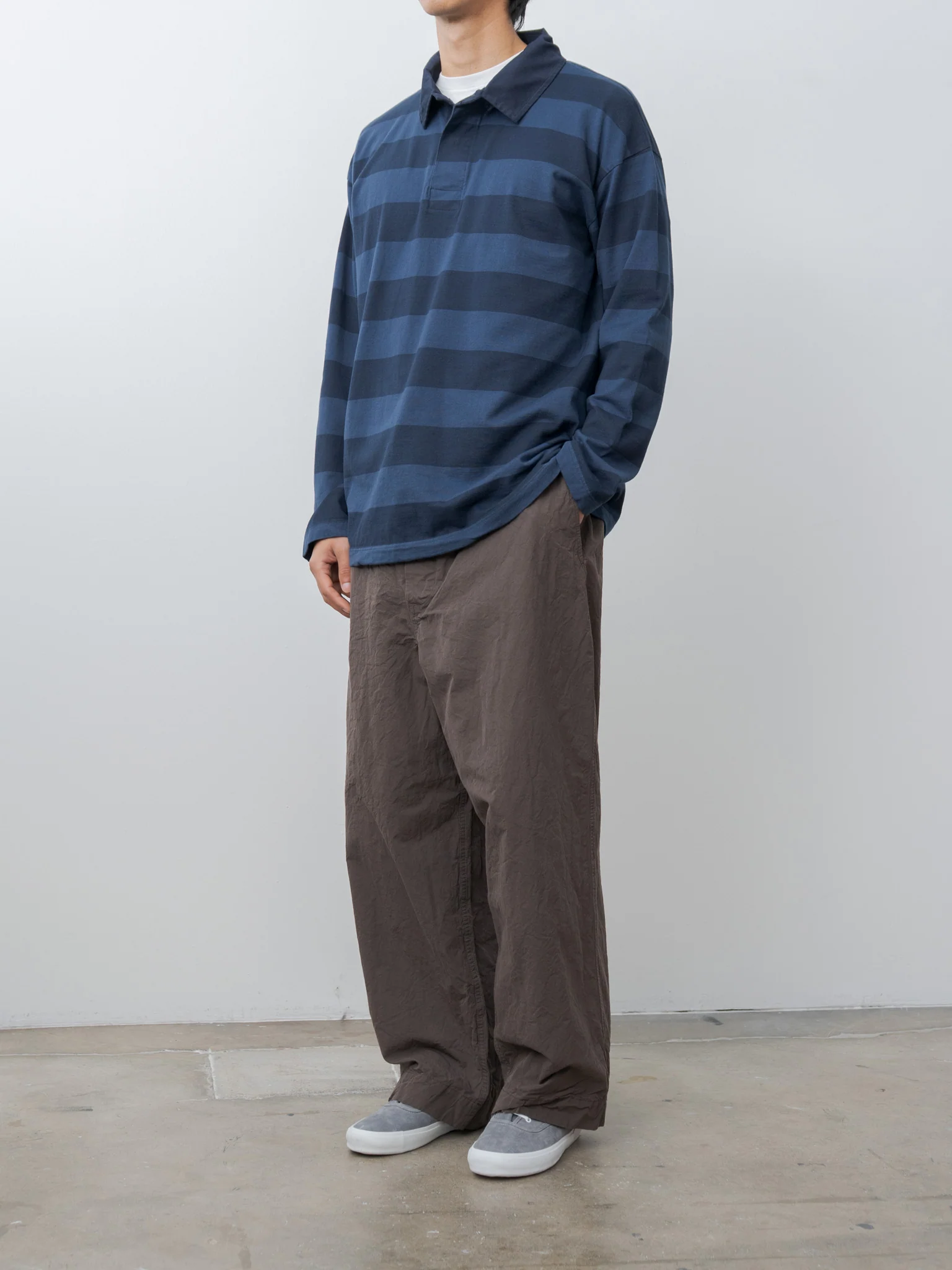 A garment dyed long-sleeve rugby shirt made from a lightweight striped cotton jersey. Features a contrast fabric rugby collar, a short concealed front placket, dropped shoulders, straight sleeves with clean cuffs, and a straight hem. Relaxed fit.