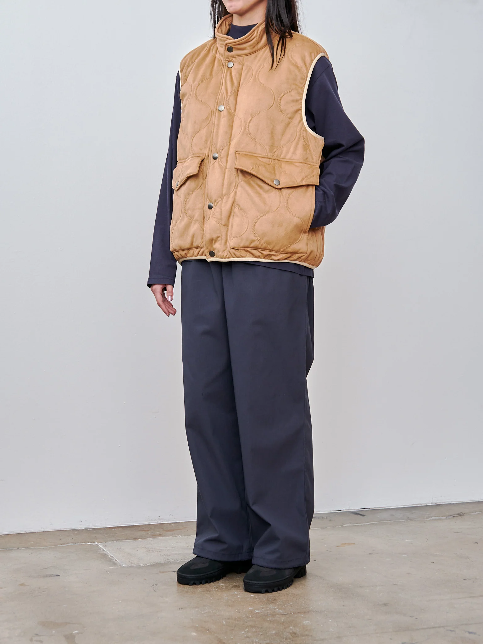 A lightly padded high neck vest from ts(s) featuring a smooth, quilted vegan nubuck. We love the contrasting materials - corduroy trim, soft vegan nubuck outer and technical lining. Other details include a snap button front opening and patch pockets on the front.