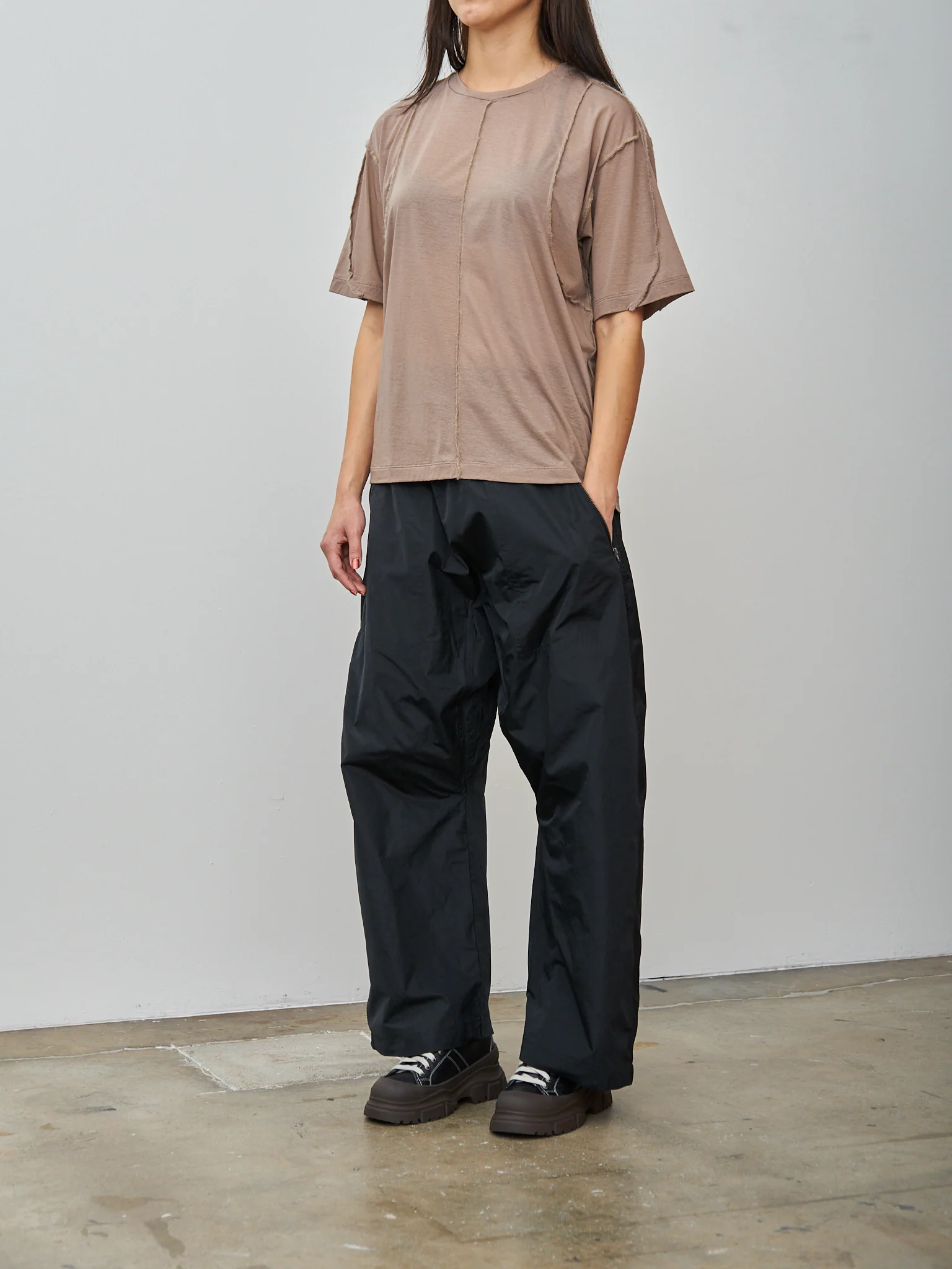 A loose-fitting T-shirt from Unfil featuring mohair stitched seams on the shoulders and armholes. The fabric has been knitted from highly twisted cotton and then specially processed to give it elasticity - it is very lightweight, slightly sheer, stretchy and soft. Hand wash recommended. Relaxed fit.